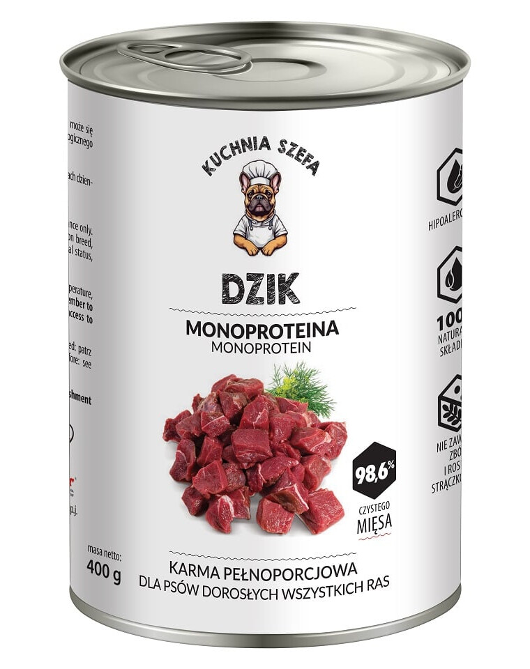 Kuchnia Szefa Džik Monoproteīna ir luksusa piedāvājums suņiem, kuri vēlas sajust dabas savvaļas garšu katrā maltītē.