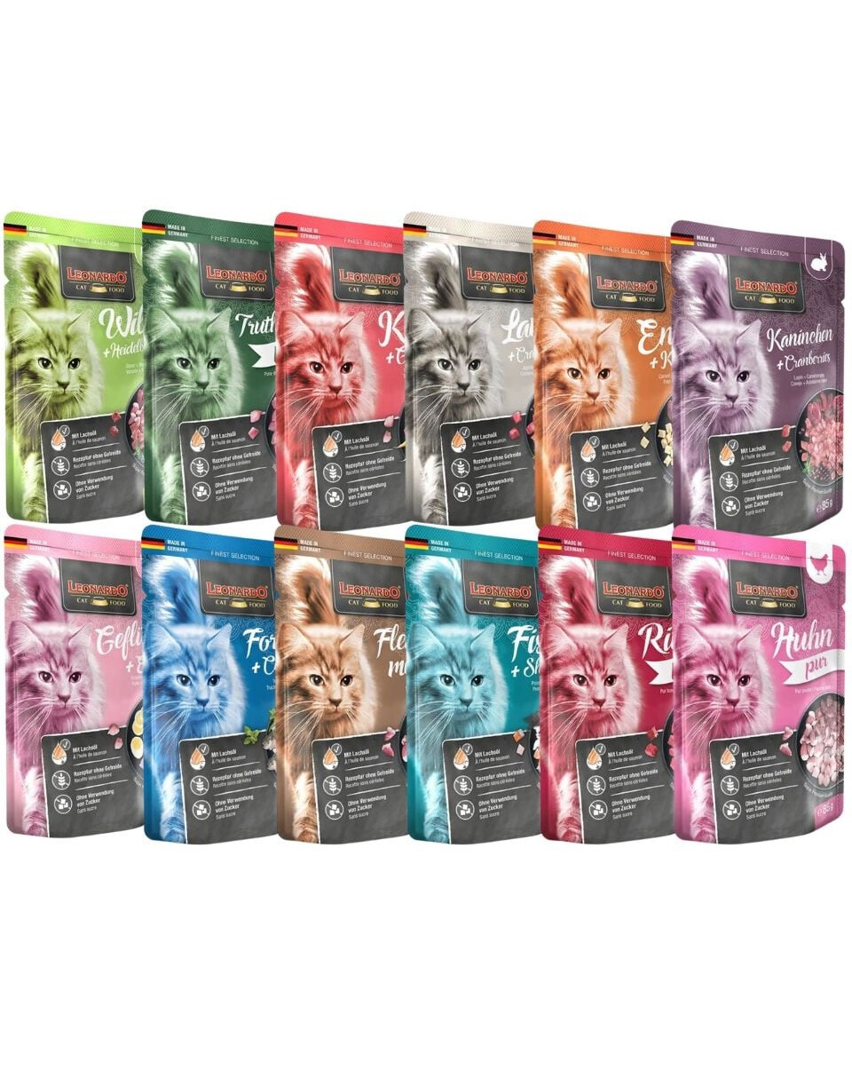 "Leonardo" trušu un dzērveņu barība Sastāvs Trušu gaļa, sirds, aknas, plaušas, nieres (30%); vistas gaļa, aknas, sirds (30%); trušu, vistas un liellopu gaļas buljons (28,3%); liellopu gaļas plaušas (6,5%); dzērvenes (4%); olu čaumalas*¹ (0,5%); minerālvielas (0,5%); laša eļļa (0,2%) *¹ žāvēts Analītiskās sastāvdaļas Olbaltumvielas 11%; Tauku saturs 5 %; koppelni 2 %; jēlpelni 2 %; jēlšķiedra 0,3 %; mitruma saturs 80 % Piedevas 1 kg Uztura piedevas D3 vitamīns 200 SV; E vitamīns 50 mg; taurīns 1 000 mg; mangāns (kā mangāna sulfāta monohidrāts) 2 mg; cinks (kā cinka sulfāta monohidrāts) 20 mg; jods (kā bezūdens kalcija jodāts) 0. 2 mg -Leonardo pīle un siers Sastāvs Pīles gaļa, aknas, sirds (30%); vistas sirds, aknas (28,5%); pīles, vistas un liellopa gaļas buljons (28,3%); liellopa plaušas (8%); siera kubiņi (4%); olu čaumalas*¹ (0,5%); minerālvielas (0,5%); laša eļļa (0,2%) *¹ žāvēts Analītiskās sastāvdaļas Olbaltumvielas 11%; Tauku saturs 5 %; jēlpelni 2 %; jēlšķiedra 0,3 %; mitruma saturs 79 % Piedevas 1 kg Uztura piedevas D3 vitamīns 200 SV; E vitamīns 50 mg; taurīns 1 000 mg; mangāns (kā mangāna sulfāta monohidrāts) 2 mg; cinks (kā cinka sulfāta monohidrāts) 20 mg; jods (kā bezūdens kalcija jodāts) 0. 2 mg -Leonardo barība ar jēra gaļu un dzērvenēm Sastāvs Jēra gaļa, sirds, aknas, plaušas, plaušas, nieres (36,5 %); mājputnu gaļa, sirds, aknas (30 %); jēra un mājputnu buljons (28,3 %); dzērvenes (4 %); olu čaumalas*¹ (0,5 %); minerālvielas (0,5 %); laša eļļa (0,2 %) *¹ žāvēts Analītiskās sastāvdaļas Olbaltumvielas 11 %; Tauku saturs 5 %; koppelni 2 %; jēlpelni 2 %; jēlšķiedra 0,3 %; mitruma saturs 80 % Piedevas 1 kg Uztura piedevas D3 vitamīns 200 SV; E vitamīns 50 mg; taurīns 1 000 mg; mangāns (kā mangāna sulfāta monohidrāts) 2 mg; cinks (kā cinka sulfāta monohidrāts) 20 mg; jods (kā bezūdens kalcija jodāts) 0. 2 mg -Leonardo Teļa gaļas un dārzeņu barība Sastāvs Teļa gaļas sirds, plaušas, nieres (36,5 %); mājputnu gaļa, sirds, aknas (30 %); teļa gaļas un mājputnu buljons (28,3 %); burkāni (4 %); olu čaumalas*¹ (0,5 %); minerālvielas (0,5 %); laša eļļa (0,2 %) *¹ žāvēts Analītiskās sastāvdaļas Olbaltumvielas 11 %; Tauku saturs 4,5 %; jēlpelni 2 %; jēlšķiedra 0,3 %; mitruma saturs 80 % Piedevas 1 kg Uztura piedevas D3 vitamīns 200 SV; E vitamīns 50 mg; taurīns 1 000 mg; mangāns (kā mangāna sulfāta monohidrāts) 2 mg; cinks (kā cinka sulfāta monohidrāts) 20 mg; jods (kā bezūdens kalcija jodāts) 0. 2 mg -Leonardo gaļas ēdienkarte Sastāvs Vistas gaļa, aknas, kuņģi (29%); Liellopu gaļa, sirds (29%); Vistas, liellopu un jēra gaļas buljons (28,8%); Jēra plaušas (12%); Olu čaumalas*¹ (0,5%); Minerālvielas (0,5%); Laša eļļa (0,2%) *¹ žāvēts Analītiskās sastāvdaļas Olbaltumvielas 10,7%; Tauku saturs 7%; jēlpelni 1,9%; jēlšķiedra 0,3%; mitruma saturs 80% Piedevas 1 kg Uztura piedevas D3 vitamīns 200 SV; E vitamīns 50 mg; taurīns 1000 mg; mangāns (kā mangāna sulfāta monohidrāts) 2 mg; cinks (kā cinka sulfāta monohidrāts) 20 mg; jods (kā bezūdens kalcija jodāts) 0. 2 mg -Leonardo vistas barība Sastāvs Vistas gaļa, aknas, sirds, kuņģa gaļa (70 %); vistas buljons (28,8 %); olu čaumalas*¹ (0,5 %); minerālvielas (0,5 %); laša eļļa (0,2 %) *¹ žāvēta Analītiskās sastāvdaļas Olbaltumvielas 11,2 %; Tauku saturs 5,6 %; Koppelni 2,2 %; Kopšķiedra 0,3 %; Mitrums 80 % Piedevas 1 kg Uztura piedevas D3 vitamīns 200 SV; E vitamīns 50 mg; Taurīns 1 000 mg; Mangāns (mangāna sulfāta monohidrāta veidā) 2 mg; Cinks (cinka sulfāta monohidrāta veidā) 20 mg; Jods (bezūdens kalcija jodāta veidā) 0. 2 mg -Leonardo barība ar brieža gaļu un mellenēm Sastāvs Mājputnu sirds, aknas, kuņģa gaļa (37%); medījuma gaļa (30%); gaļas buljons (29,8%); mellenes (2%); olu čaumalas*¹ (0,5%); minerālvielas (0,5%); laša eļļa (0,2%) *¹ žāvēts Analītiskās sastāvdaļas Olbaltumvielas 11%; Tauku saturs 6%; koppelni 2,1%; jēlpelni 2,1%; jēlšķiedra 0,3%; mitruma saturs 79% Piedevas 1 kg Uztura piedevas D3 vitamīns 200 SV; E vitamīns 50 mg; taurīns 1000 mg; mangāns (kā mangāna sulfāta monohidrāts) 2 mg; cinks (kā cinka sulfāta monohidrāts) 20 mg; jods (kā bezūdens kalcija jodāts) 0. 2 mg -Leonardo tītara barība Sastāvs Tītara gaļa, aknas, sirds, kuņģa gaļa (70 %); gaļas buljons (28,8 %); olu čaumalas*¹ (0,5 %); minerālvielas (0,5 %); laša eļļa (0,2 %) *¹ žāvēta Analītiskie komponenti Olbaltumvielas 11,5 %; Tauki 6,5 %; Neapstrādāti pelni 2,1 %; Kopšķiedra 0,3 %; mitruma saturs 78,5 % Piedevas 1 kg Uzturvērtība D3 vitamīns 200 SV; E vitamīns 50 mg; taurīns 1 000 mg; mangāns (mangāna sulfāta monohidrāta veidā) 2 mg; cinks (cinka sulfāta monohidrāta veidā) 20 mg; jods (bezūdens kalcija jodāta veidā) 0. 2 mg -Leonardo liellopu gaļas barība Sastāvs Liellopu gaļa, sirdis, plaušas, aknas, nieres (70 %); liellopu gaļas buljons (28,8 %); olu čaumalas*¹ (0,5 %); minerālvielas (0,5 %); lašu eļļa (0,2 %) *¹ žāvēta Analītiskās sastāvdaļas Olbaltumvielas 10,6 %; tauki 5,9 %; Koppelni 1,6 %; Kopšķiedra 0,3 %; Mitrums 81 % Piedevas 1 kg Uztura piedevas D3 vitamīns 200 SV; E vitamīns 50 mg; Taurīns 1 000 mg; Mangāns (mangāna sulfāta monohidrāta veidā) 2 mg; Cinks (cinka sulfāta monohidrāta veidā) 20 mg; Jods (bezūdens kalcija jodāta veidā) 0. 2 mg -Leonardo zivju ēdienkarte Sastāvs Lasis (30%); siļķes, laša un garneļu buljons (28,8%); siļķe (18%); garneles (12%); mājputnu aknas (10%); olu čaumalas*¹ (0,5%); minerālvielas (0,5%); laša eļļa (0,2%) *¹ žāvēts Analītiskās sastāvdaļas Olbaltumvielas 11,5%; Tauku saturs 5%; Koppelni 2,4 %; jēlšķiedra 0,3 %; mitrums 80 % Piedevas 1 kg Uztura piedevas D3 vitamīns 200 SV; E vitamīns 50 mg; taurīns 1 000 mg; mangāns (kā man