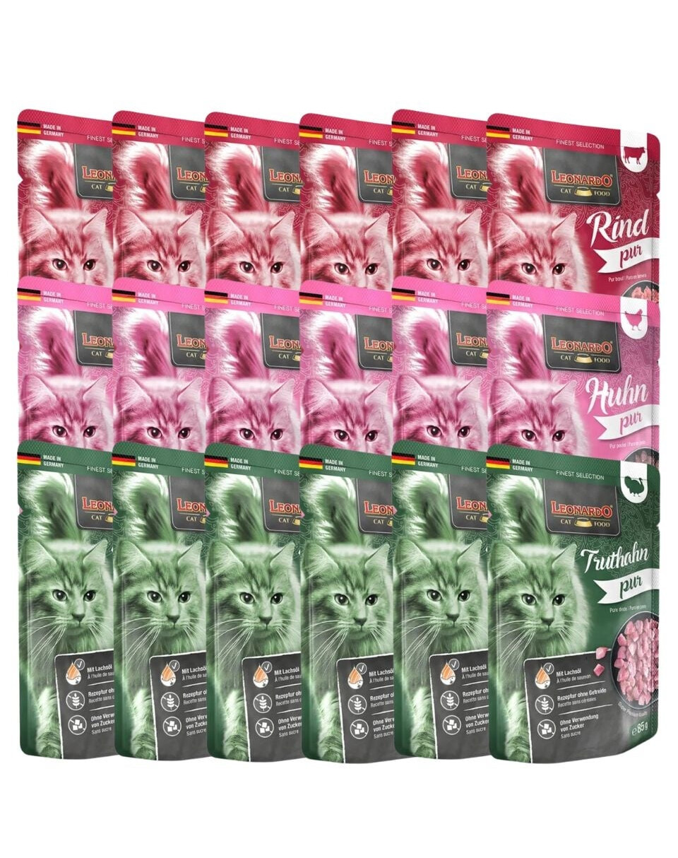 "LEONARDO Finest Selection Mixed Flavours" Liellopu gaļa, vistas gaļa, tītara gaļa 18x85 g Liellopu gaļa Sastāvs Liellopu gaļa, sirdis, plaušas, aknas, nieres (70%); liellopu gaļas buljons (28,8%); olu čaumalas*¹ (0,5%); minerālvielas (0,5%); laša eļļa (0,2%) *¹ žāvēts Analītiskās sastāvdaļas Olbaltumvielas 10,6%; Tauku saturs 5,9 %; jēlpelni 1,6 %; jēlšķiedra 0,3 %; mitruma saturs 81 % Piedevas 1 kg Uztura piedevas D3 vitamīns 200 SV; E vitamīns 50 mg; taurīns 1 000 mg; mangāns (kā mangāna sulfāta monohidrāts) 2 mg; cinks (kā cinka sulfāta monohidrāts) 20 mg; jods (kā bezūdens kalcija jodāts) 0. 2 mg Tītara sastāvs Tītara gaļa, aknas, sirds, kuņģa gaļa (70 %); gaļas buljons (28,8 %); olu čaumalas*¹ (0,5 %); minerālvielas (0,5 %); laša eļļa (0,2 %) *¹ žāvēta Analītiskie komponenti Olbaltumvielas 11,5 %; tauki 6,5 %; jēlpelni 2,1 %; Kopšķiedra 0,3 %; mitruma saturs 78,5 % Piedevas 1 kg Uztura piedevas D3 vitamīns 200 SV; E vitamīns 50 mg; taurīns 1 000 mg; mangāns (mangāna sulfāta monohidrāta veidā) 2 mg; cinks (cinka sulfāta monohidrāta veidā) 20 mg; jods (bezūdens kalcija jodāta veidā) 0. 2 mg Vistas gaļas sastāvs Vistas gaļa, aknas, sirds, kuņģa gaļa (70%); vistas buljons (28,8%); olu čaumalas*¹ (0,5%); minerālvielas (0,5%); laša eļļa (0,2%) *¹ žāvēta Analītiskās sastāvdaļas Olbaltumvielas 11,2%; tauki 5,6%; pelni 2,2%; Kopšķiedra 0,3 %; mitruma saturs 80 % Piedevas 1 kg Uztura piedevas D3 vitamīns 200 SV; E vitamīns 50 mg; taurīns 1 000 mg; mangāns (mangāna sulfāta monohidrāta veidā) 2 mg; cinks (cinka sulfāta monohidrāta veidā) 20 mg; jods (bezūdens kalcija jodāta veidā) 0. 2 mg "