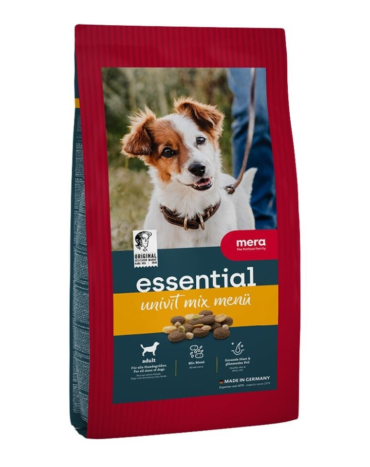 MERA Essential Univit Mix Menu ir ideāls izvēle pieaugušiem suņiem visu šķirņu ar normālu aktivitāti. Izveidota pēc pārbaudītām ģimenes receptēm, tā apvieno augstu garšīgumu, veselīgus sastāvdaļus un pilnu ikdienas uzturvērtību.