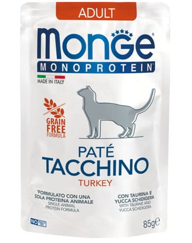 MONGE Monoprotein Adult Cat Paté Turkey ir pilnvērtīgs, sabalansēts barības produkts pieaugušiem kaķiem, kas pieder unikālajai Monge Monoprotein Superpremium sērijai. Recepte balstās uz vienu dzīvnieku olbaltumvielu avotu – tītaru, kas raksturojas ar augstu sagremojamību un izcilu uzsūkšanos.