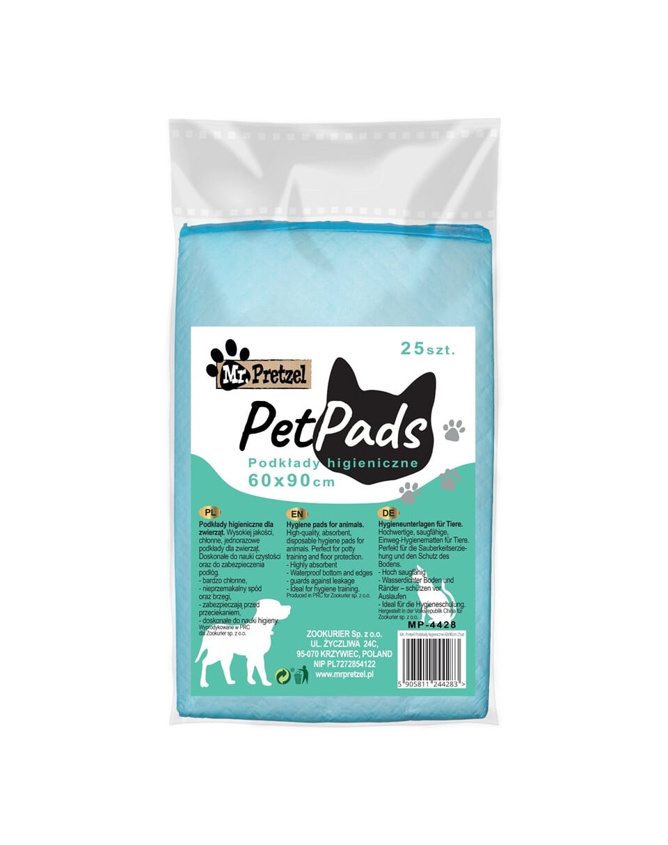 Higiēniskie paliktņi Mr. Pretzel ir premium klases produkts, kas palīdz uzturēt tīrību un higiēnu mājās, kā arī vietās, kur uzturas jūsu suns. Lielā izmēra 60×90 cm dēļ tie nodrošina vēl labāku virsmas aizsardzību un lietošanas komfortu. Ideāli piemēroti tīrības apmācībai kucēniem, kā arī vecākiem, slimiem vai atveseļošanās procesā esošiem suņiem.