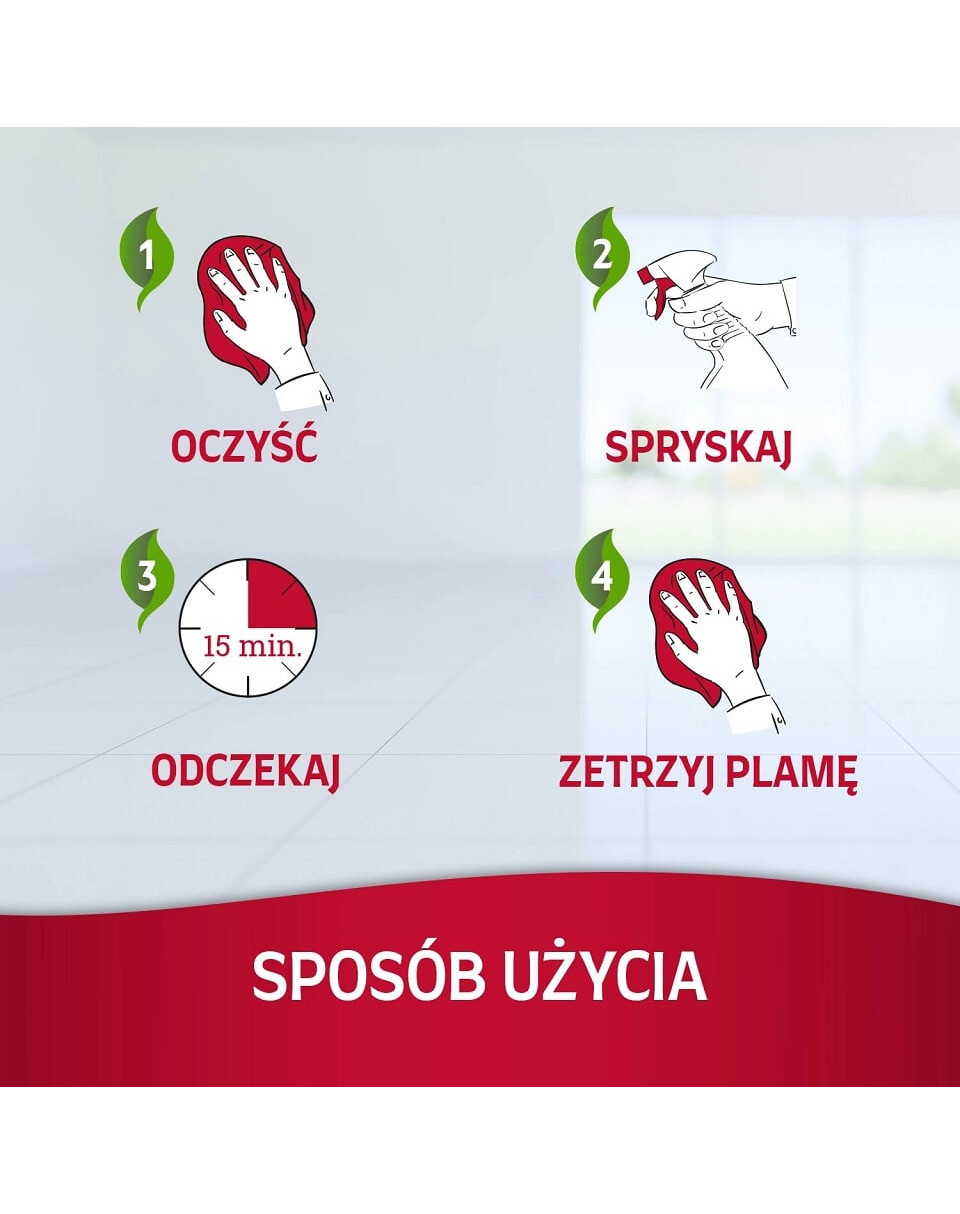 Sarežģīti traipi: pirms līdzekļa lietošanas maigi noskrubējiet traipa vietu un atstājiet to 15 minūtes.
