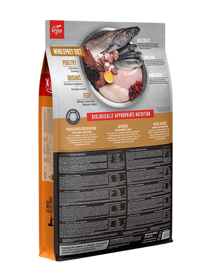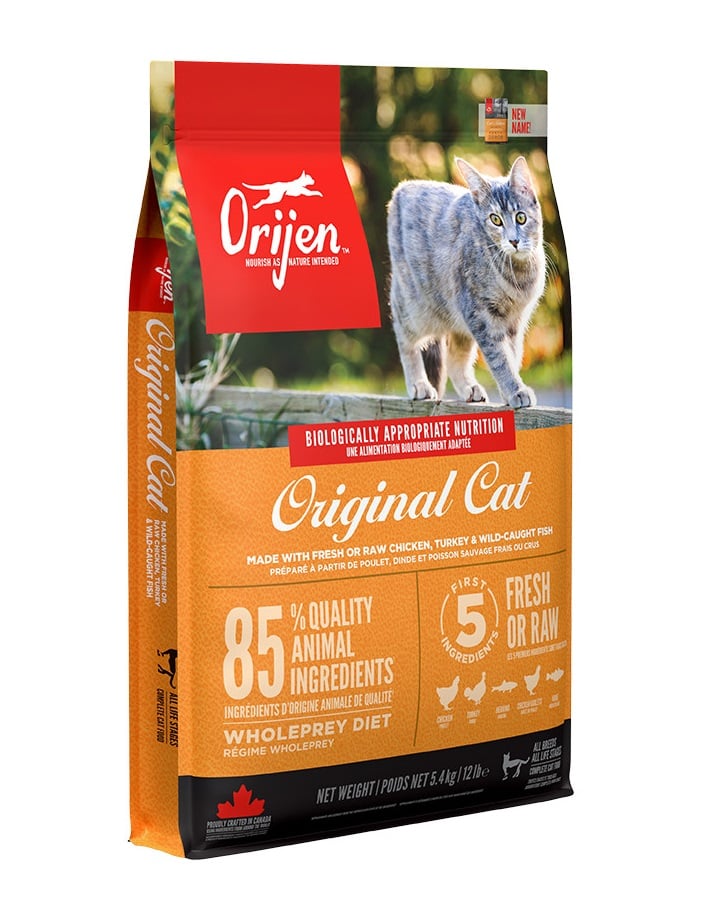 Orijen izveidotās inovatīvās formulas pamatā ir olbaltumvielām bagāti dzīvnieku izcelsmes produkti. Orijen Cat sastāvā ir 85 % gaļas.