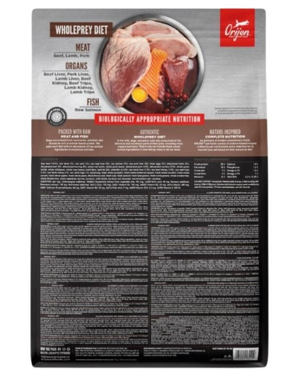 SASTĀVS: SASTĀVDAĻAS: jēla liellopu gaļa (18,5%), jēla jēra gaļa (7%), jēla cūkgaļa (7%), jēlas liellopu aknas (5%), jēls lasis (5%), jēlas cūkgaļas aknas (5%), svaigas olas (5%), dehidrēta jēra gaļa (5%), dehidrēta liellopu gaļa (5%), dehidrēta reņģe (5%), veselas sarkanās lēcas, veselas pinto pupiņas, dehidrēta cūkgaļa (3,5 %), dehidrētas sardīnes (3,5 %), veselas zaļās lēcas, veseli aunazirņi, veselas baltās pupiņas, lēcas šķiedrvielas, liellopu gaļas tauki (2 %), saidu eļļa (2 %), jēra aknas (1,5 %), jēlas liellopu gaļas nieres (1,5 %), jēlas liellopu gaļas kuņģis (1,5 %), jēlas jēra nieres (1 %), jēra gaļas kuņģis (1 %), kaltētas jūraszāles, svaigs vesels ķirbis, svaigs vesels muskusmelons, svaigs vesels kabačs, svaigs vesels burkāns, svaigs vesels ābols, svaigs vesels bumbieris, kaltētas cigoriņu saknes, svaigi kāposti, svaigi spināti, svaigas biešu lapas, svaigas rāceņu lapas, veselas dzērvenes, veselas mellenes, veselas saskatoņu ogas, kurkuma, piena dadzis, dadzis, dadzis, lavanda, baldriāna sakne, mežrozītes.