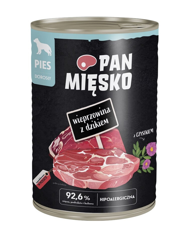 Iepazīsties ar augstākās kvalitātes mitro barību suņiem Pan Mięsko. Tās sastāvā ir rūpīgi izvēlēta gaļa ar pievienotiem sulīgiem Polijas āboliem un vērtīgām piedevām, piemēram, garšaugiem vai sēklām, kas pozitīvi ietekmē Tava suņa veselību un stāvokli. Mūsu receptes ir izstrādātas speciālistu, lai nodrošinātu Tavu četrkājaino draugu tieši ar to, kas viņam nepieciešams. Tavs suns pelnījis visu labāko.