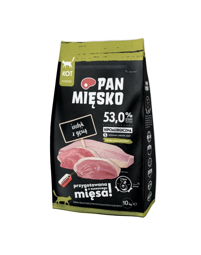 Iepazīstieties ar hipoalerģisko sauso kaķu barību Pan Mięsko. Tā izceļas ar rūpīgi atlasītu gaļu ar sulīgiem poļu āboliem, veselīgiem dārzeņiem un vērtīgām uzturvielām, kas pozitīvi ietekmēs jūsu kaķa veselību un kondīciju. Mūsu receptes ir sagatavojuši speciālisti, lai nodrošinātu jūsu četrkājainajam kompanjonam tieši to, kas tam nepieciešams. Jūsu kaķis ir pelnījis labāko.