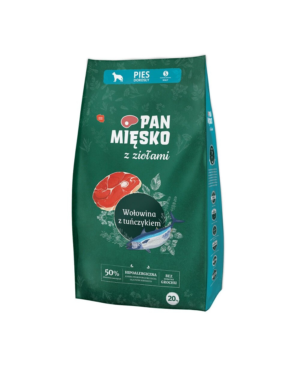 Dried beef (30 %), tapioca, rice, poultry fat (13 %), dried tuna (4 %), hydrolysed chicken liver (3 %), dried chicory pulp (3 %) (contains 10 % FOS and inulin), herbs (0.4 % fennel, 0.1 % calendula, 0.1 % nettle leaves, 0,1 % piparmētru lapu, 0,1 % kumelīšu ziedu, 0,1 % genciānas saknes un 0,1 % ķimeņu sēklu), minerālvielas, laša eļļa (0,5 %), kaltēts alus raugs (0,2 %), Juka Mojave, MOS (mannooligosaharīdi) (400 ppm), glikozamīns (400 ppm), hondroitīna sulfāts (400 ppm).