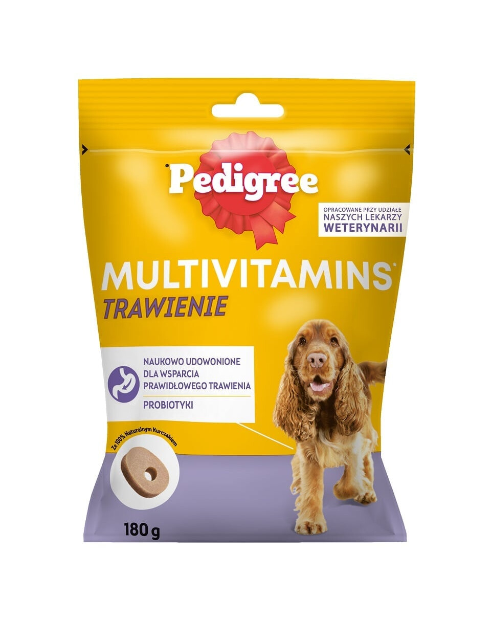 PEDIGREE Multivitamins Digestion ir papildbarība pieaugušiem suņiem ar vistas gaļas garšu. Pateicoties probiotiku (Bacillus velezensis) saturam, tā ietekmē veselīga zarnu mikrobioma uzturēšanu un atbalsta gremošanu, kas ir zinātniski pierādīts. Sastāvu izstrādājuši WALTHAM Dzīvnieku zinātnes institūta veterinārārsti un uztura speciālisti. Ar PEDIGREE Multivitamins Digestion jūs efektīvi rūpēsieties par sava suņa veselību un vitalitāti. Katrā porcijā ir īpaši pielāgots multivitamīnu un probiotiku maisījums. Šī papildbarība ir izstrādāta no augstākās kvalitātes sastāvdaļām, neizmantojot mākslīgās krāsvielas un aromatizētājus. Iepakojumā ir aptuveni 30 gabaliņi.