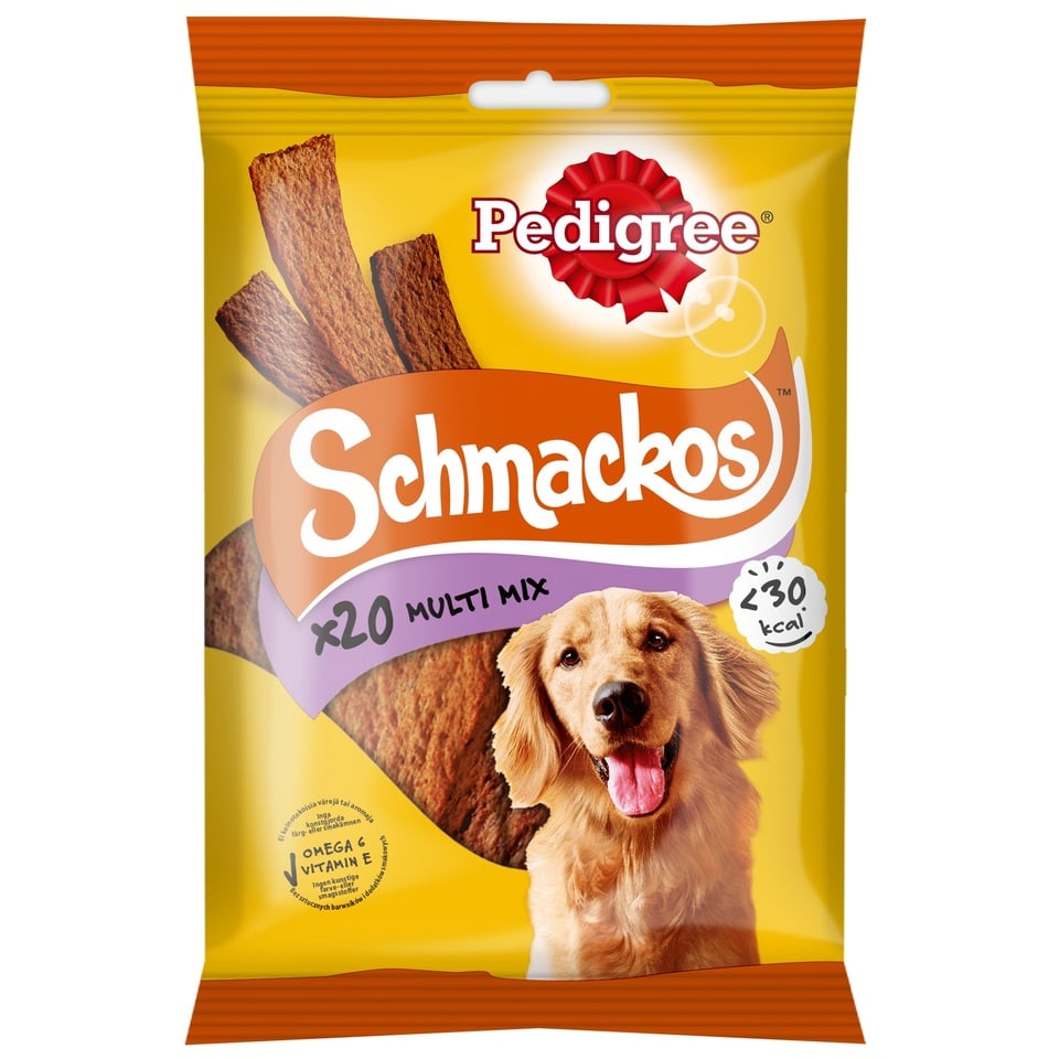PEDIGREE Schmackos Multi Mix suņu uzkodas sloksnīšu formā, viegli saplēšamas mazos gabaliņos. Lieliski piemērotas pastaigām, treniņiem un rotaļām ar suni mājās. PEDIGREE Schmackos ir lielisks jūsu suņa ikdienas uztura papildinājums, kas nodrošina svarīgas uzturvielas, piemēram, A un E vitamīnus un dzelzi. Šis suņu našķis tika izstrādāts, iesaistoties veterinārārstiem un uztura ekspertiem no Wellhow Institute of Animal Science. Šis suņu našķis nesatur mākslīgās krāsvielas vai aromatizētājus. Mazāk nekā 30 kalorijas vienā batoniņā!