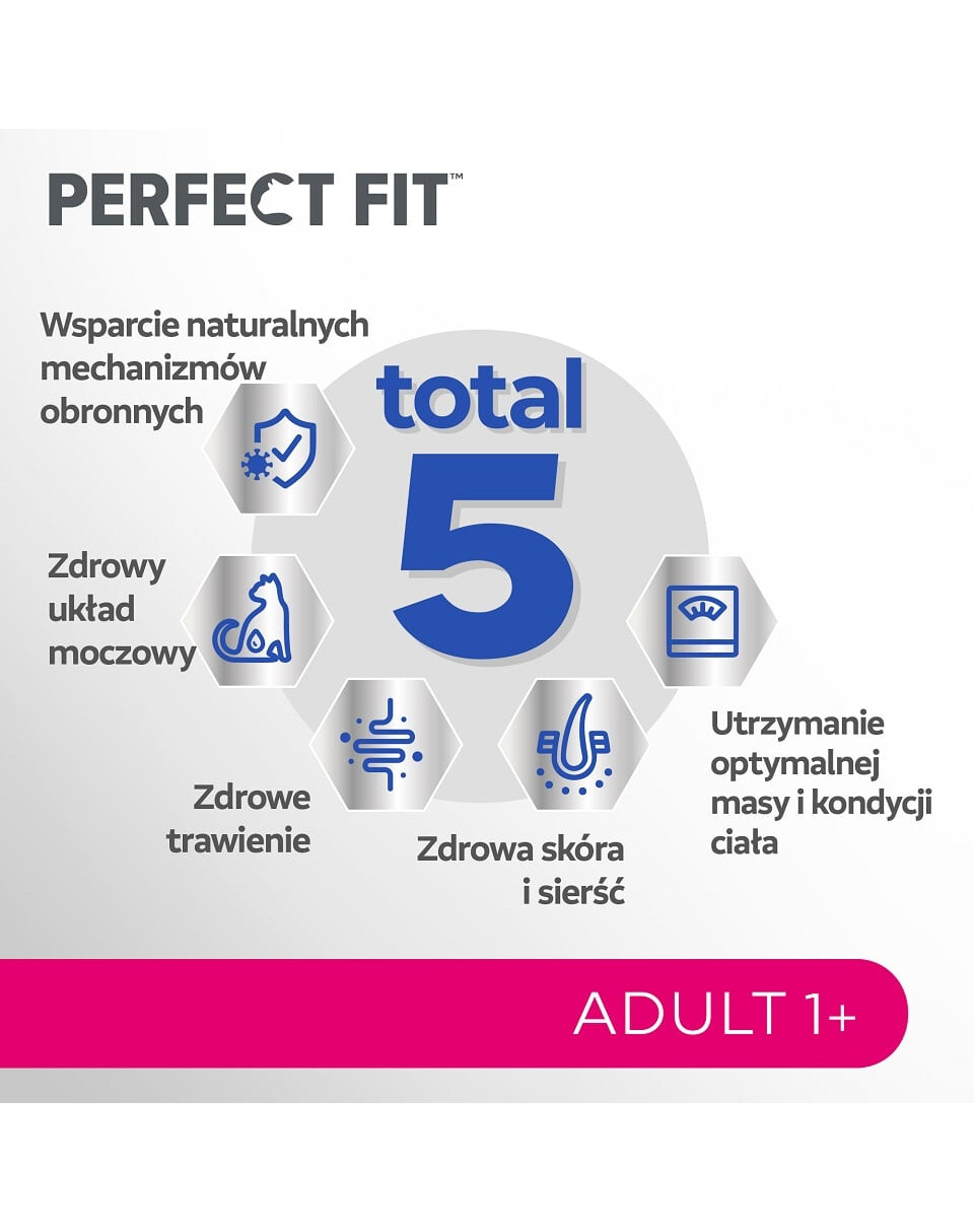 Pagaršīga barība Perfect Fit Adult 1+ ar svaigu lasi satur unikālu formulu Total 5, kas atbalsta 5 svarīgākās pieauguša mājdzīvnieka veselības jomas: stiprina imūnsistēmu, veicina veselīgu gremošanu, nodrošina veselīgu urīnceļu sistēmu, veselīgu ādu un kažoku, kā arī uztur optimālu ķermeņa stāvokli un svaru. Perfect Fit Adult 1+ recepte ir izstrādāta sadarbībā ar veterinārārstiem un uztura speciālistiem no WALTHAM Dzīvnieku Zinātnes Institūta, lai nodrošinātu nepieciešamās barības vielas pieaugušiem kaķiem. Tāpat kā citas variācijas, arī barība Perfect Fit Adult 1+ ar svaigu lasi sniedz papildu priekšrocības: atbalsta dzīvotspēju un veiklību, stipras muskuļus, veselīgas smaganas un zobus, kā arī satur dabiskos prebiotikas, lai rūpētos par zarnu mikrobiomu. Izvēloties šo barību savam mājdzīvniekam, jūs varat būt droši, ka unikālā Perfect Fit formula atbalsta visa jūsu kaķa ķermeņa veselību un nodrošina papildu veselības ieguvumus, kas ir īpaši pielāgoti viņa vecumam un individuālajām prasībām.