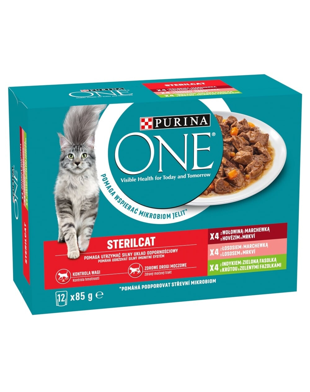 PURINA ONE Sterilcat ir pilnvērtīga mitrā barība pieaugušiem kaķiem pēc sterilizācijas, pieejama variantos ar liellopu gaļu un burkāniem, ar lasi un burkāniem, kā arī ar tītaru un zaļajiem pupiņām.