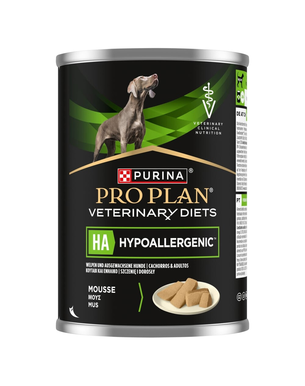 Purina PRO PLAN Veterinary Diets HA Hypoallergenic ir diētiska, mitra barība maigā musā, kas paredzēta kucēniem un pieaugušiem suņiem ar pārtikas nepanesamību un alerģijām.