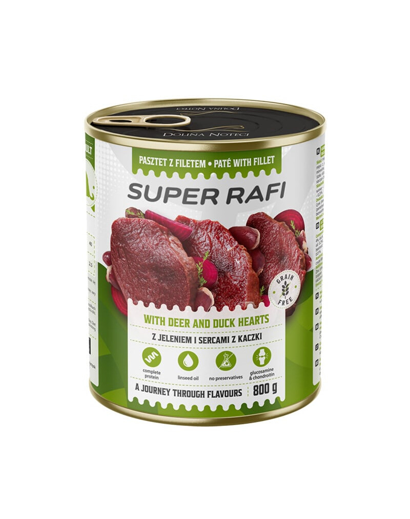Izvēlieties augstu kvalitāti un izcilu garšu – izvēlieties Super RAFI pastēti ar turku filetu, briežiem un pīļu sirdīm. Jūsu suns iemīlēs šo kombināciju!