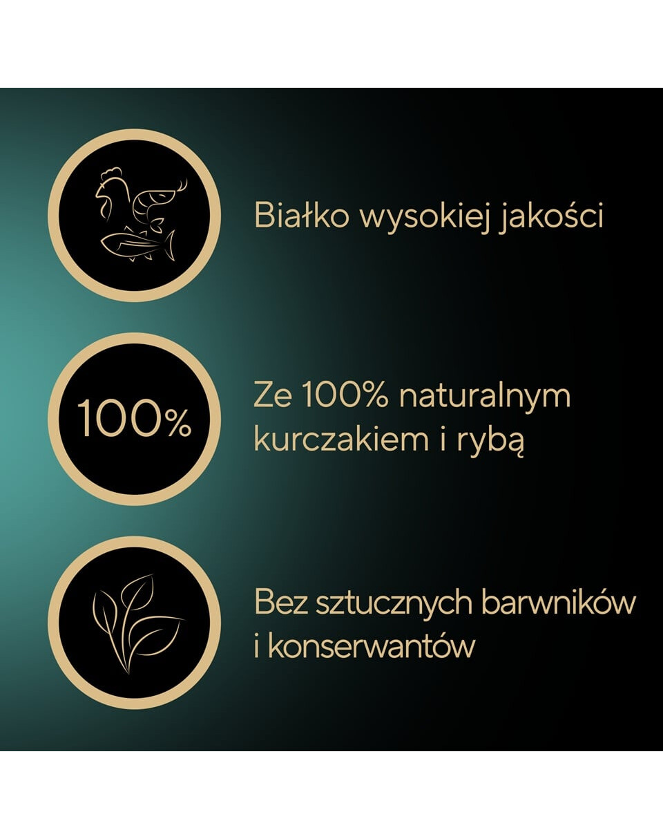 • Sagatavota ar 100% dabīgu vistu un zivīm no ilgtspējīgas zvejas, kas ir sertificēta ar MSC vai ASC.