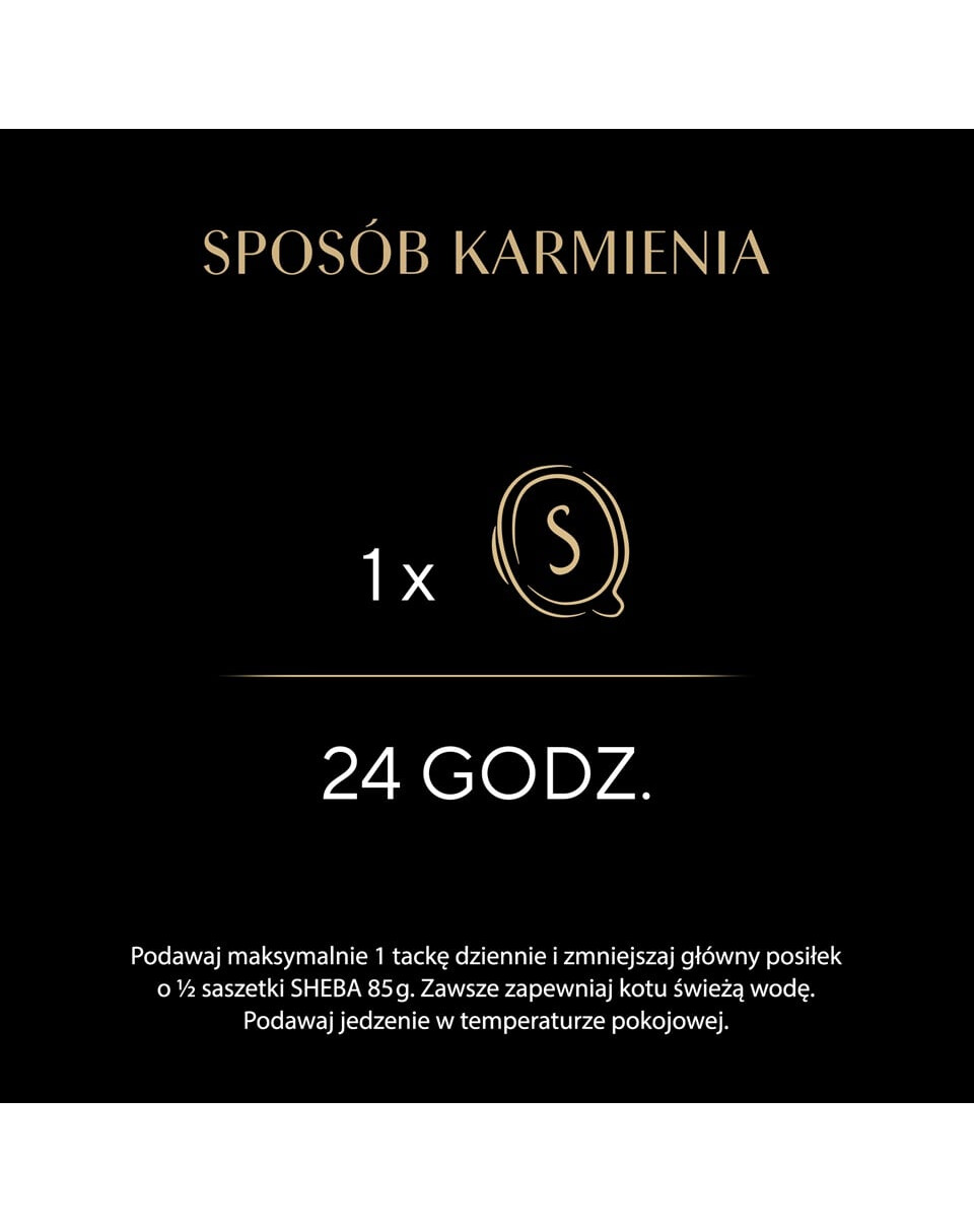 Lūdzu, pasniedziet līdz 1 iepakojumam dienā un samaziniet galveno ēdienu par 1/2 SHEBA 85 g paciņas.