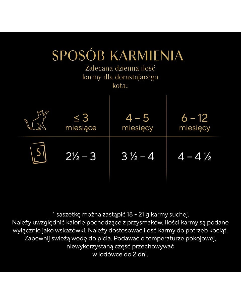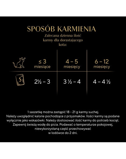 Barošana: Ieteicamais dienas daudzums kaķim: kaķim ≤ 3 mēnešu vecumam nepieciešami 2,5-3 paciņas dienā. 4-5 mēnešu vecam kaķim nepieciešami 3,5-4 paciņas dienā. 6-12 mēnešu vecam kaķim nepieciešami 4-4,5 paciņas dienā. 1 paciņu var aizstāt ar 18-21 g sausās barības.