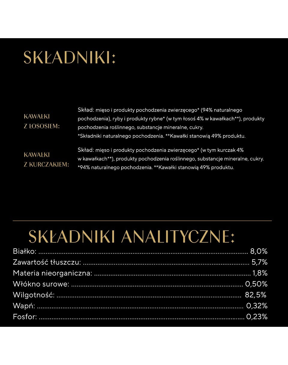 Sastāvs ar lasi: gaļa un dzīvnieku izcelsmes produkti* (94 % dabiskas izcelsmes), zivis un zivju produkti* (tostarp laši 4 % gabaliņos**), augu izcelsmes produkti, minerālvielas, cukurs. *Dabiskas izcelsmes sastāvdaļas. **Kāļi veido 49 % no produkta.