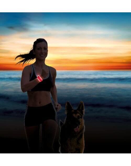 Uz rokas nēsājama mirgojoša gaismas josla. Ideāli piemērots vakara pastaigām. Tas savelkas, pateicoties iekšējai atsperei, un lieliski pieguļ, tam ir divi gaismas režīmi: mirgojošs un nepārtraukts Izgatavots no poliestera un neilona. Tas ir izturīgs pret atspīdumiem un šļakatām.