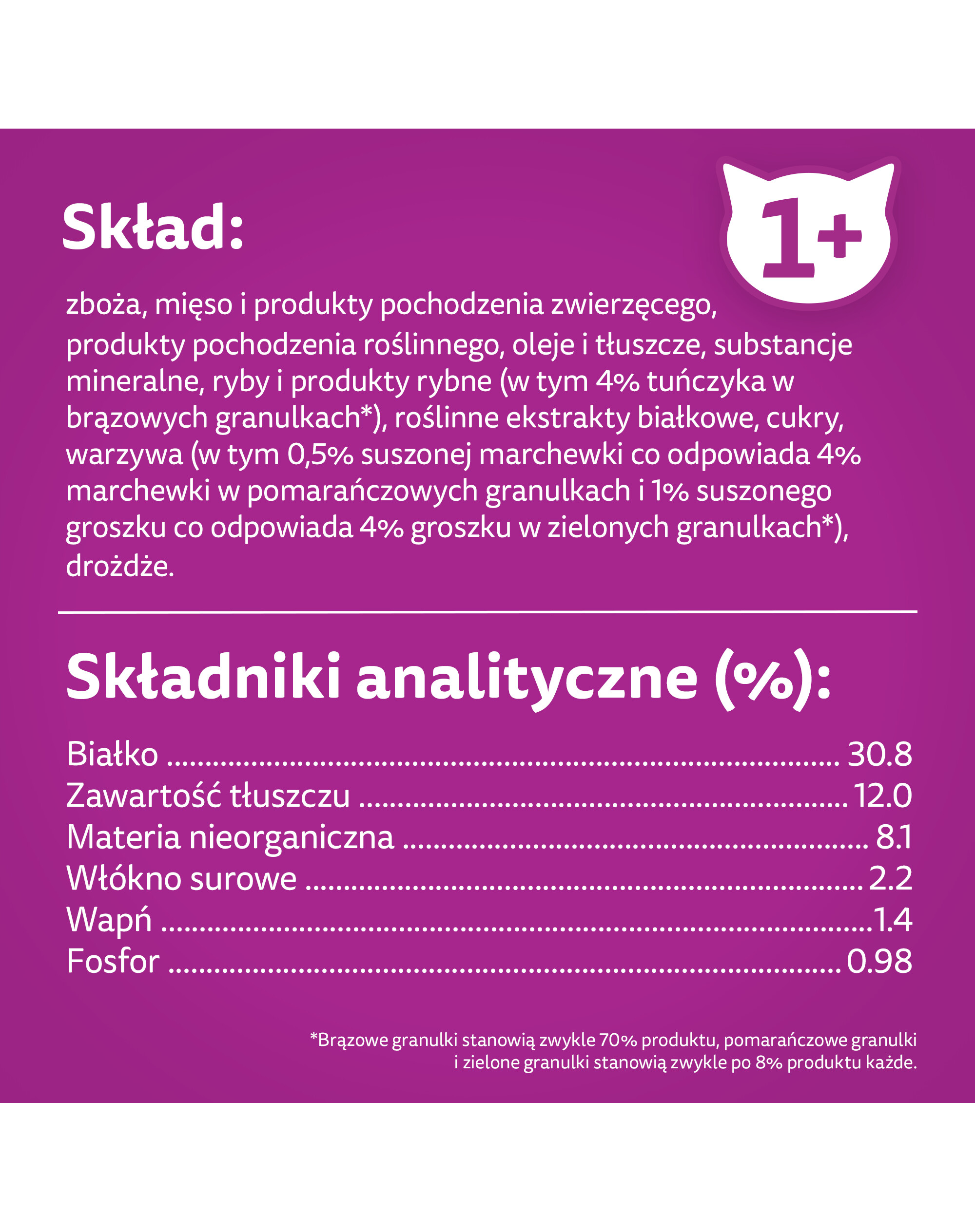 Sastāvs: graudaugi, gaļa un dzīvnieku izcelsmes produkti, augu izcelsmes produkti, eļļas un tauki, minerālvielas, zivis un zivju produkti (tostarp 4 % tunča brūnajās granulās*), augu izcelsmes olbaltumvielu ekstrakti, cukurs, dārzeņi (tostarp 0,5 % žāvētu burkānu, kas atbilst 4 % burkānu oranžajās granulās, un 1 % žāvētu zirņu, kas atbilst 4 % zirņu zaļajās granulās*), raugs.