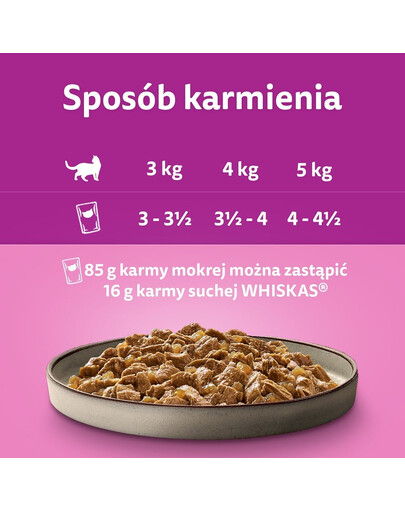 85 g mitras barības var aizstāt ar 16 g WHISKAS sausās barības.