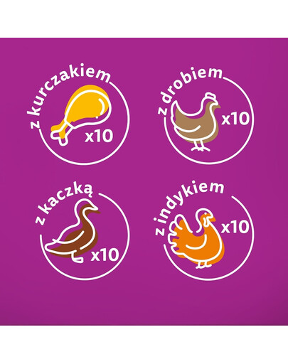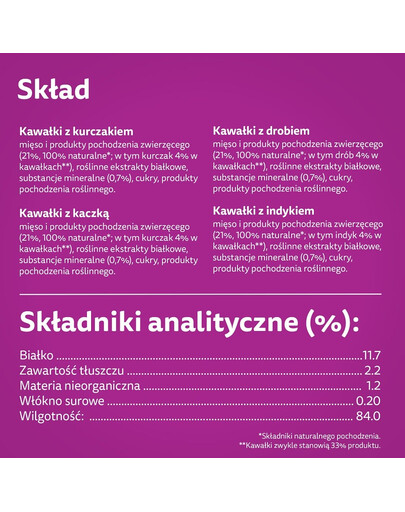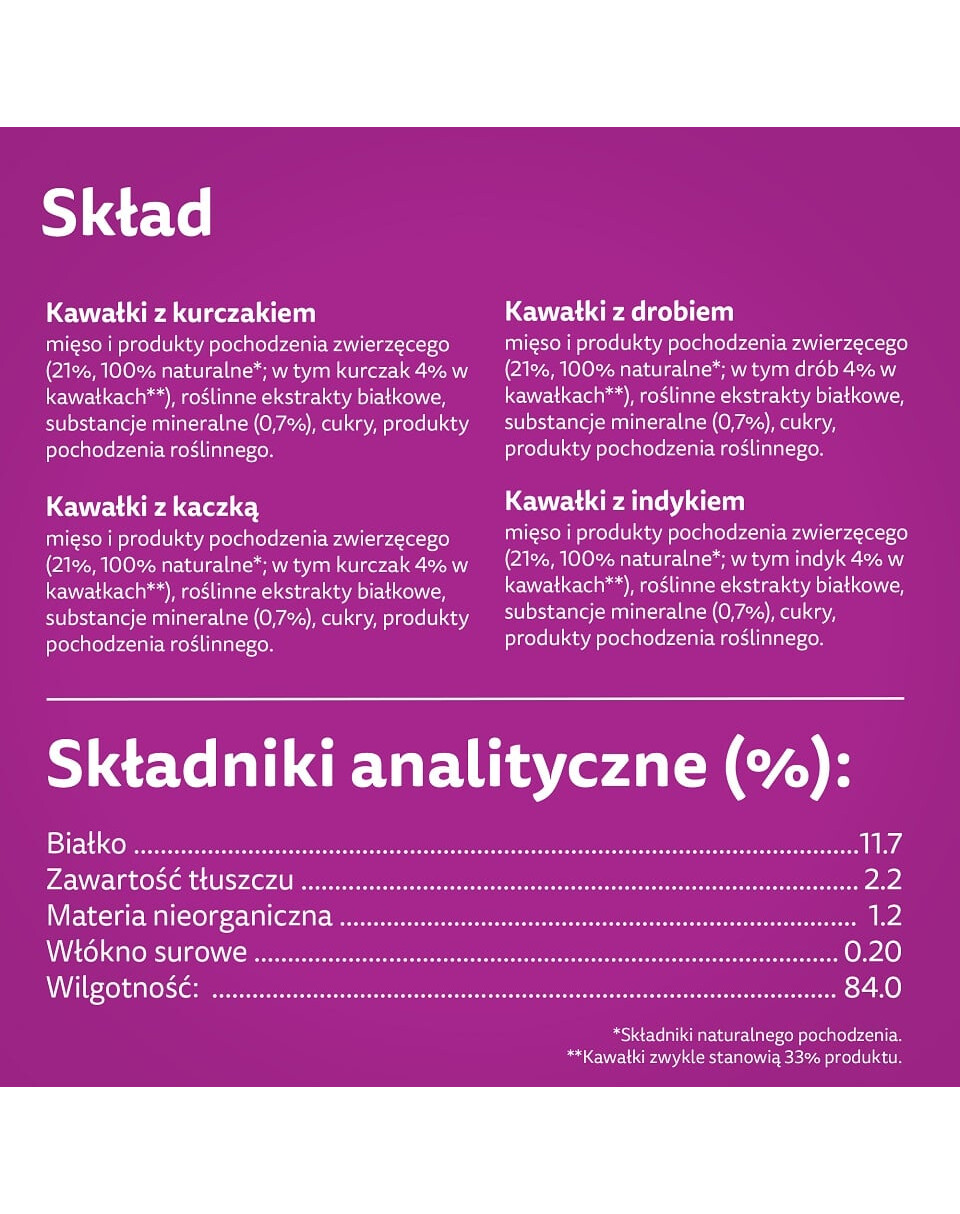 Gabaliņi ar pīli - Sastāvs: dzīvnieku izcelsmes gaļa un produkti (21%, 100% dabīgi*; tostarp vistas 4% gabaliņos**), augu olbaltumvielu ekstrakti, minerālvielas (0,7%), cukuri, augu izcelsmes produkti.*Naturālas izcelsmes sastāvdaļas. **Mājputnu gabaliņi parasti veido 33 % no produkta.