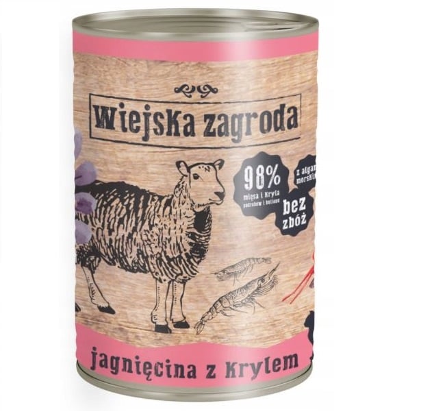 jēra gaļa 66% (no tās aptuveni 64% muskuļu un sirds gaļas, aptuveni 22,5% plaušu, aptuveni 13,5% aknu), jēra un krila buljons 28,8%, antarktiskais krils 4% (žāvēts 0,33%), minerālvielas 1%, laša eļļa 0,1%, jūras aļģes (spirulīna) 0,1%.