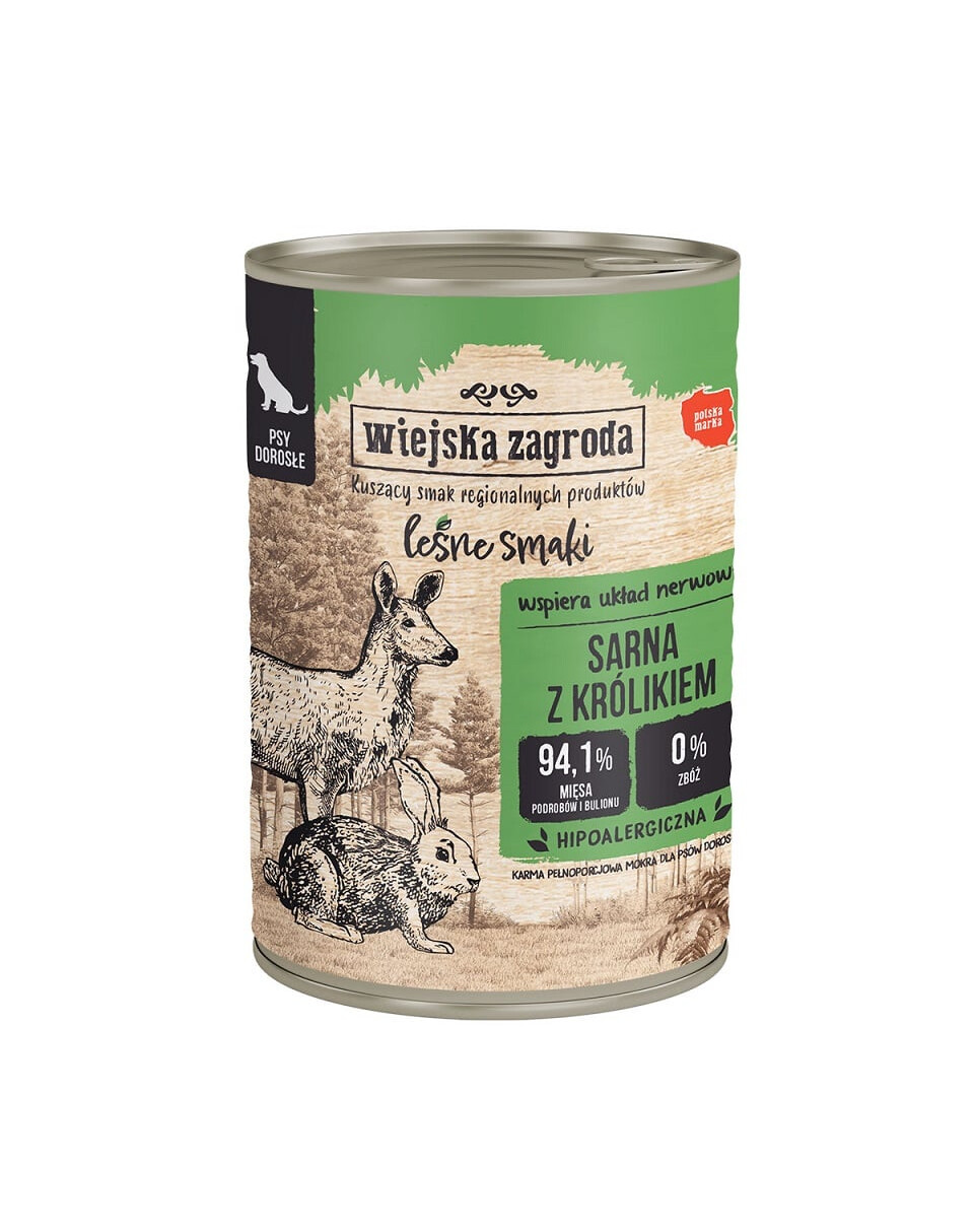 SASTĀVDAĻAS: 53 % stirnu gaļas, 15 % trušu gaļas (7 % gaļas, 3 % sirds, 3 % nieru, 3 % plaušu), 25,8 % buljona, 4 % avenes, 1 % minerālvielu, 0,3 % laša eļļas, 0,2 % kaltēta alus rauga, 0,2 % spirulīnas, 0,2 % Mojave juku, 0,2 % savvaļas rožu, 0,1 % piparmētru.