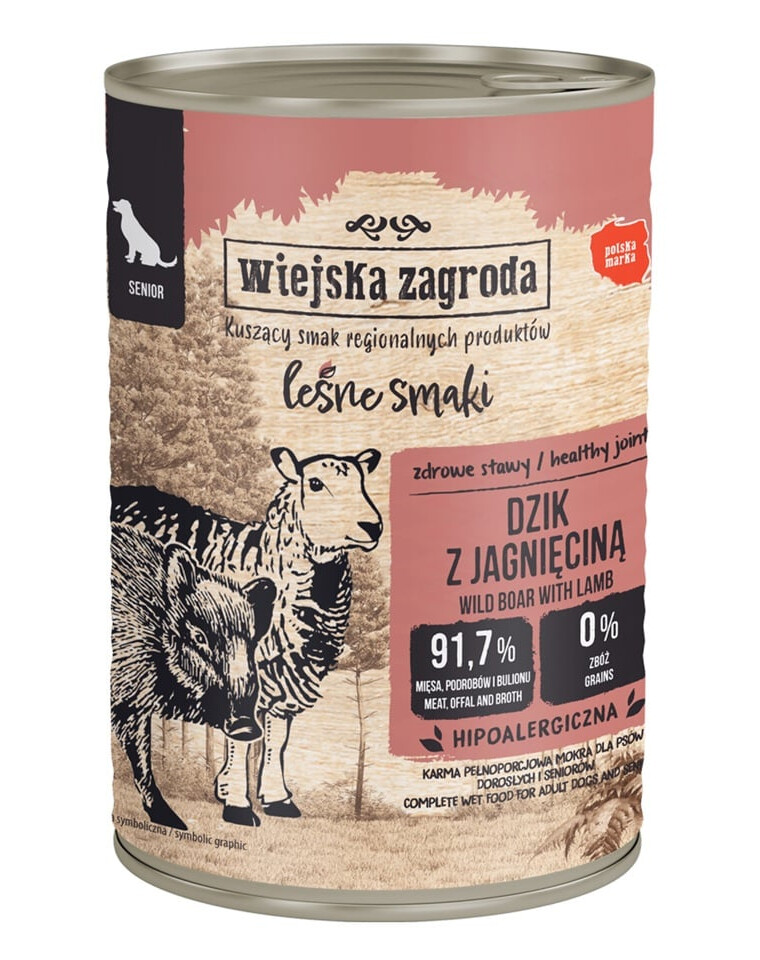 WIEJSKA ZAGRODA Meža garšas Mežacūka ar jēra gaļu mitrā barība vecākiem suņiem 400 g