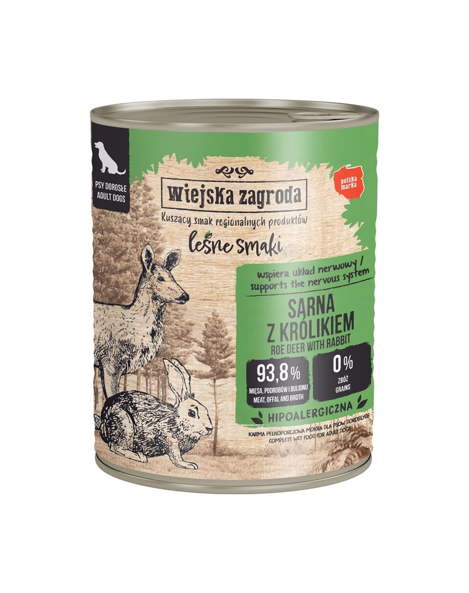 SASTĀVS: 53 % sārna gaļa, 15 % truša gaļa (7 % gaļa, 3 % sirds, 3 % nieres, 2 % plaušas), 25,8 % buljons, 4 % avenes, 1 % minerālvielas, 0,3 % laša eļļa, 0,2 % žāvēti alus raugi, 0,2 % spirulina, 0,2 % Jukka Mojave, 0,2 % mežrozīte, 0,1 % piparmētra.