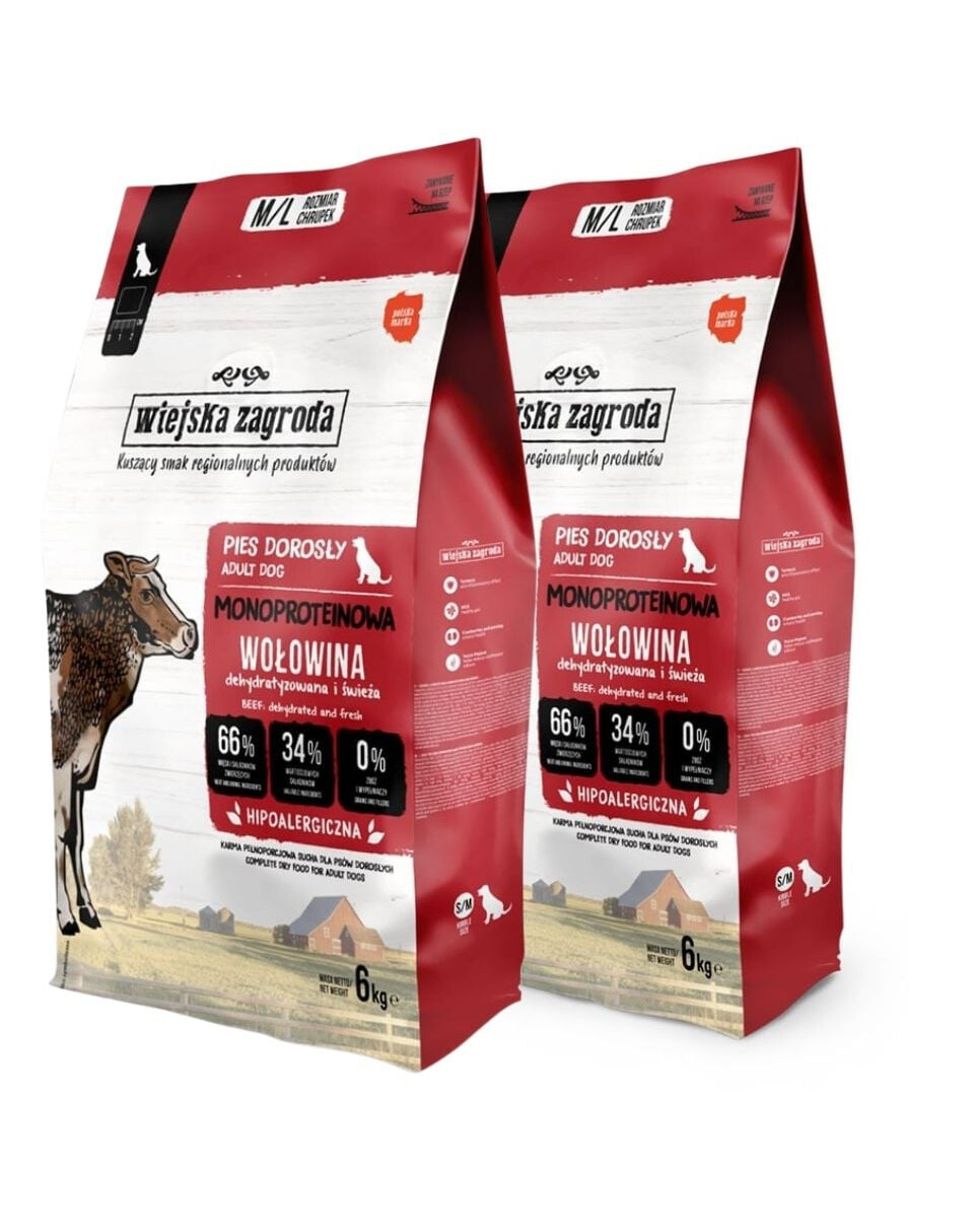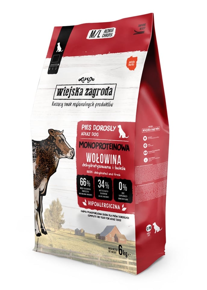 Monoproteīnu barību līnija no Wiejskiej Zagrody ir sabalansēta barība, kas paredzēta suņiem ar jutīgu gremošanas sistēmu un alerģiju noslieci. Izmantojot tikai vienu dzīvnieku olbaltumvielu avotu, bez graudiem un pākšaugiem, tiek samazināts nevēlamu reakciju risks uz barību, un virkni veselību veicinošu piedevu atbalsta pareizu gremošanu un var mazināt iekaisuma stāvokļus, ko izraisa alerģija vai atkārtotas kuņģa problēmas. Barības sastāvdaļas arī atbalsta ādas veselību un locītavu slimību profilaksi.