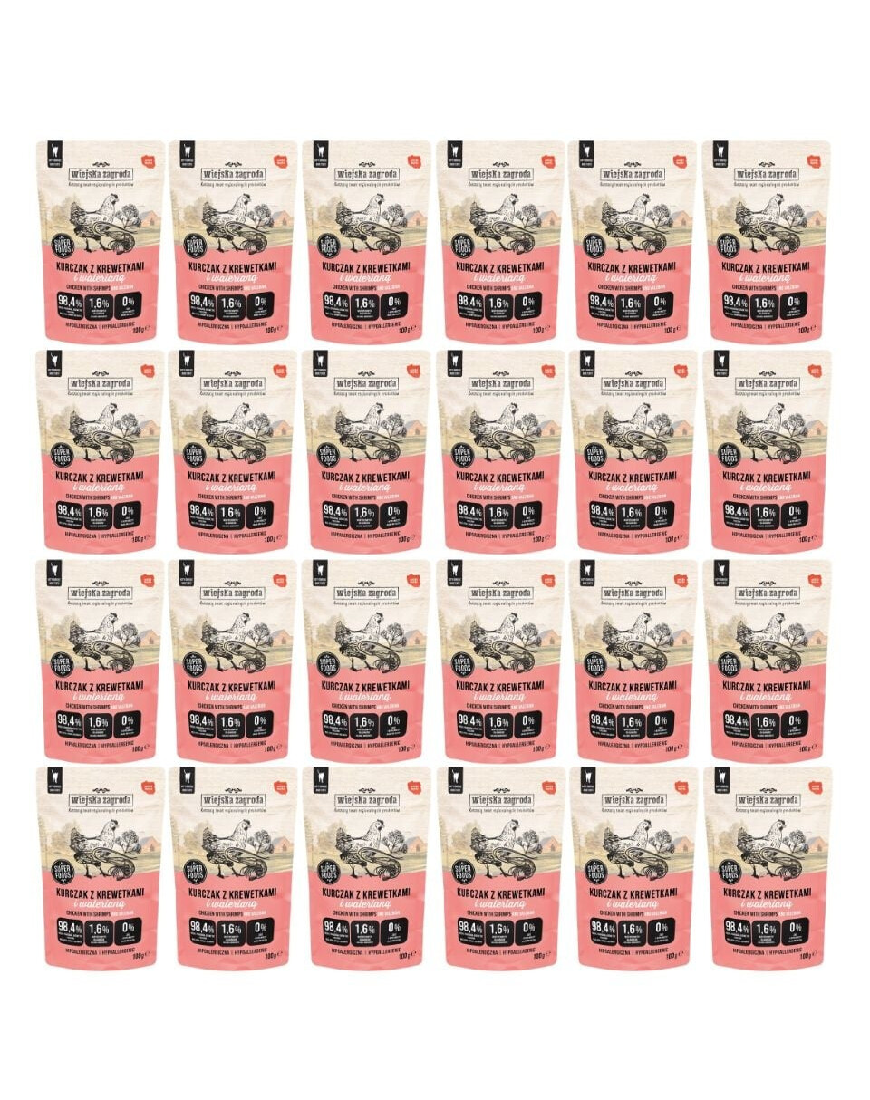 WIEJSKA ZAGRODA Superfoods Vistas ar garnelēm un valerianu mitrā barība kaķiem 24x100 g