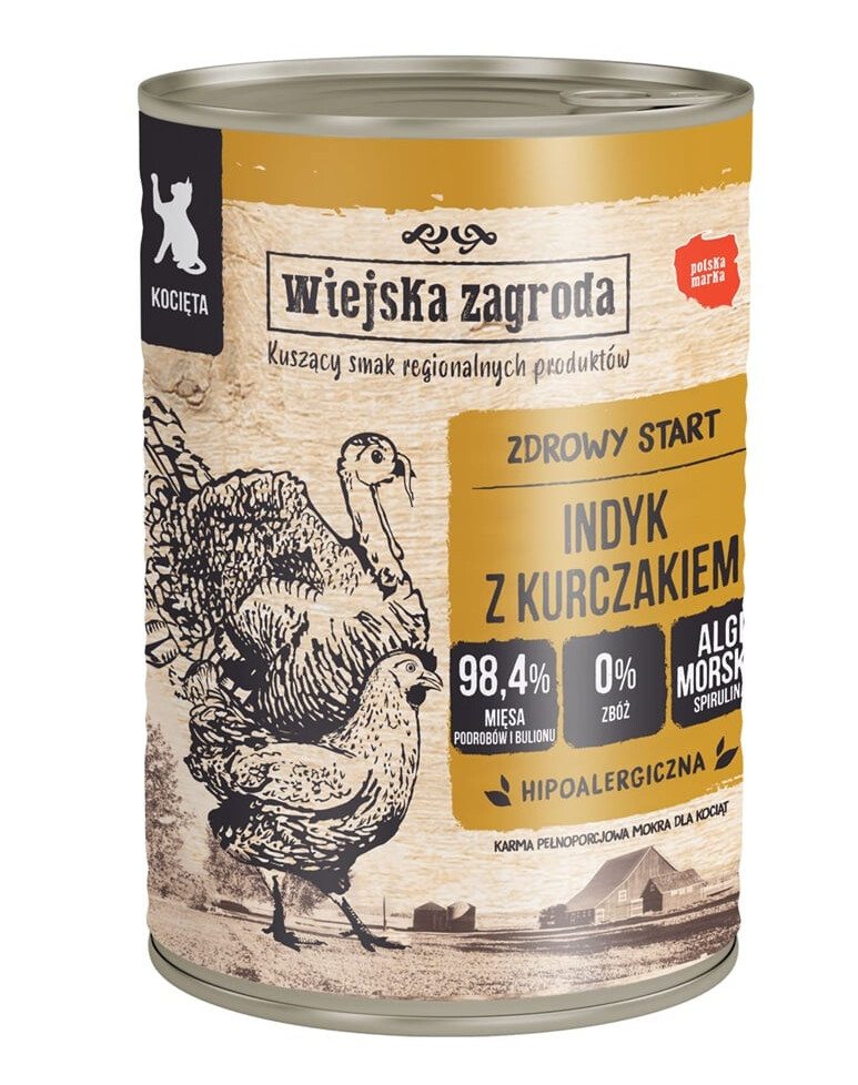 tītara gaļa 35% (no tās aptuveni 80% muskuļu un sirds gaļas, aptuveni 20% aknu), vistas gaļa 35% (100% muskuļu gaļas), tītara un vistas buljons 28,4%, minerālvielas 1%, laša eļļa 0,5%, spirulīna 0,1%.