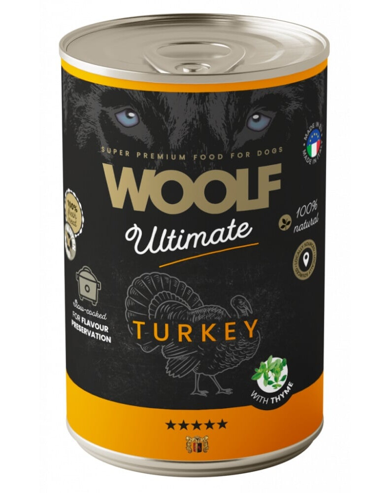 WOOLF Ultimate Adult Dog Turkey and Thyme ir pilnvērtīga, bezglutēna mitrā barība, kas izstrādāta pieaugušiem suņiem visu šķirņu. Tās recepte balstās uz tītara gaļu – viegli sagremojamu un zemu tauku avotu olbaltumvielām, kas atbalsta pareizas kondīcijas un muskuļu masas uzturēšanu. Aromātiskā timiāna pievienošana ne tikai bagātina barības garšu, bet arī atbalsta imunitāti un izrāda antioksidanta un pretiekaisuma īpašības. Visi sastāvdaļas nāk no vietējiem piegādātājiem un tiek pakļautas lēnas vārīšanas procesam zemā temperatūrā, kas ļauj saglabāt to uzturvērtības un dabisko garšīgumu.
